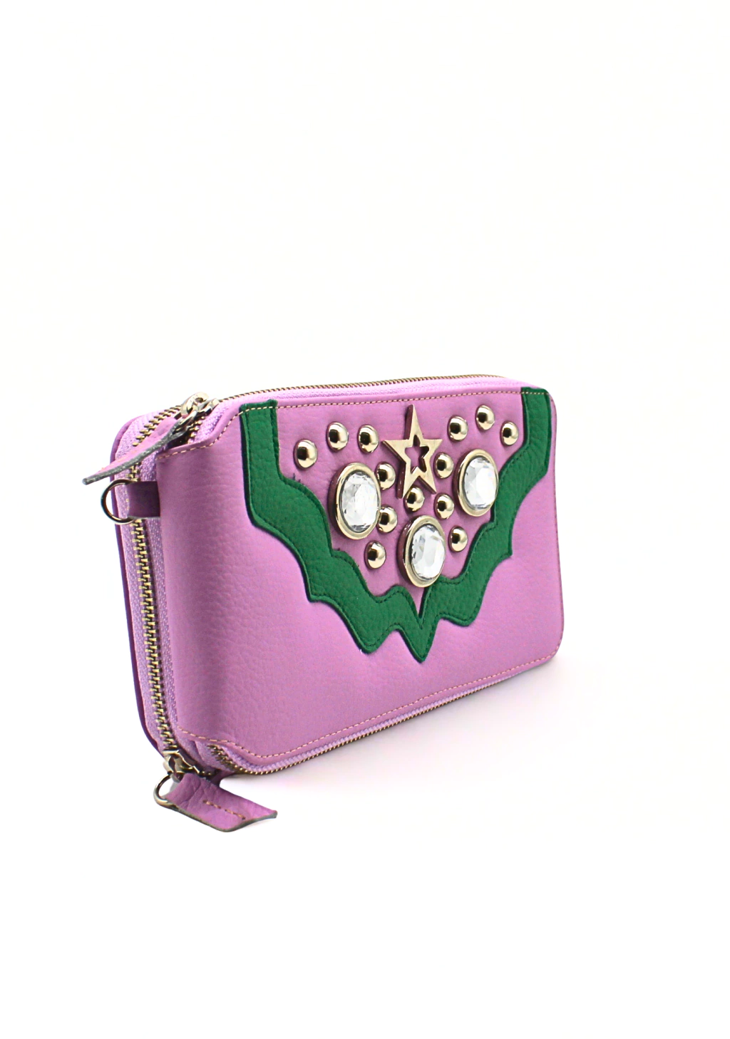 Combina distintas texturas que le dan un carácter único: un cuero base suave y otro troquelado con un delicado dibujo que enmarca un frente lleno de detalles. ✨ Tachas, remaches y strass de vidrio en color níquel aportan brillo y fuerza a una pieza verdaderamente especial.